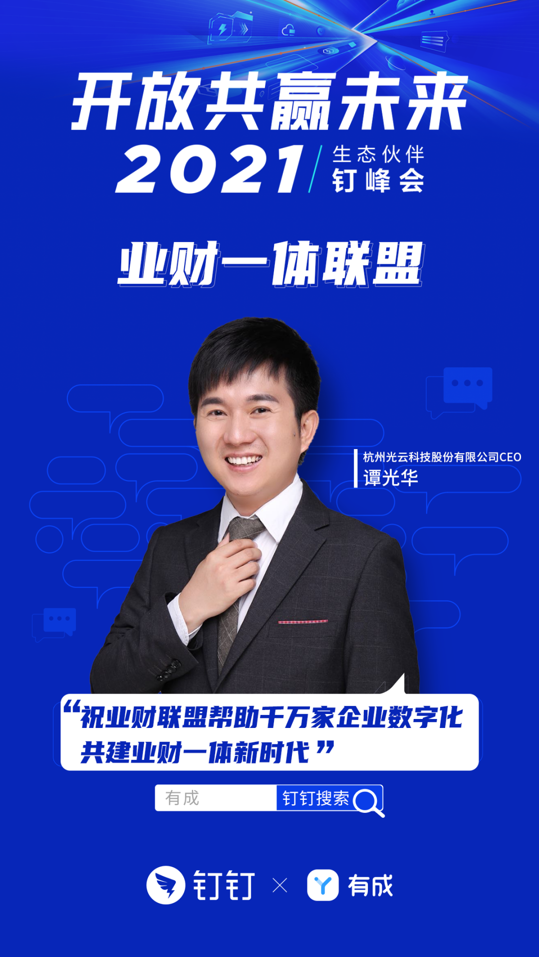 此次峰会的另一个重要议程——钉钉重磅发布了业财联盟,有成作为业财联盟的首批成员,高调亮相发布会现场,同时壹定发官网科技CEO谭光华先生也到现场,与联盟成员一起开启业财一体化新时代。