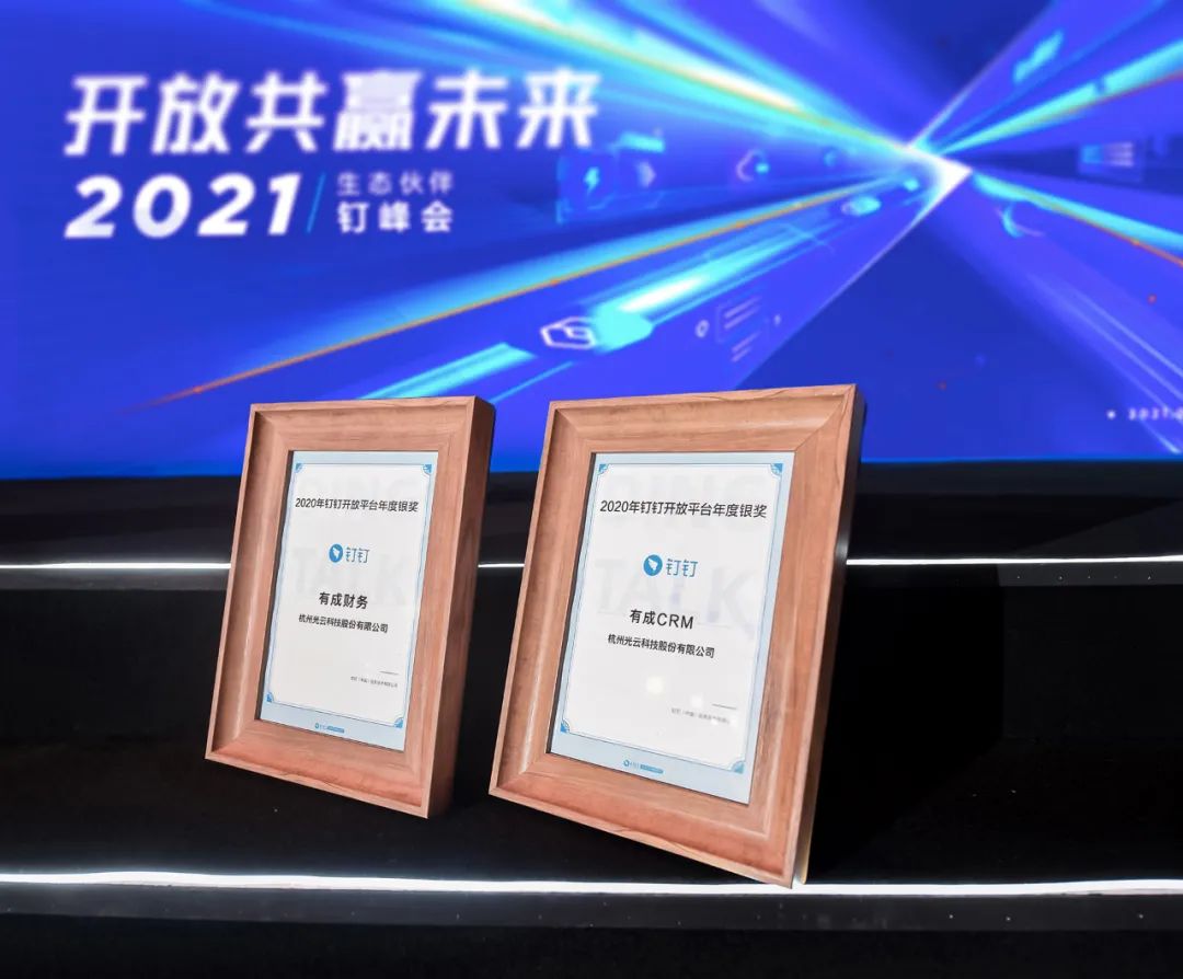 大会现场,壹定发官网科技旗下有成财务、有成CRM凭借优秀的业绩和专业的实力在一众同行中脱颖而出,斩获“2020年钉钉开放平台年度银奖”双重奖项。
