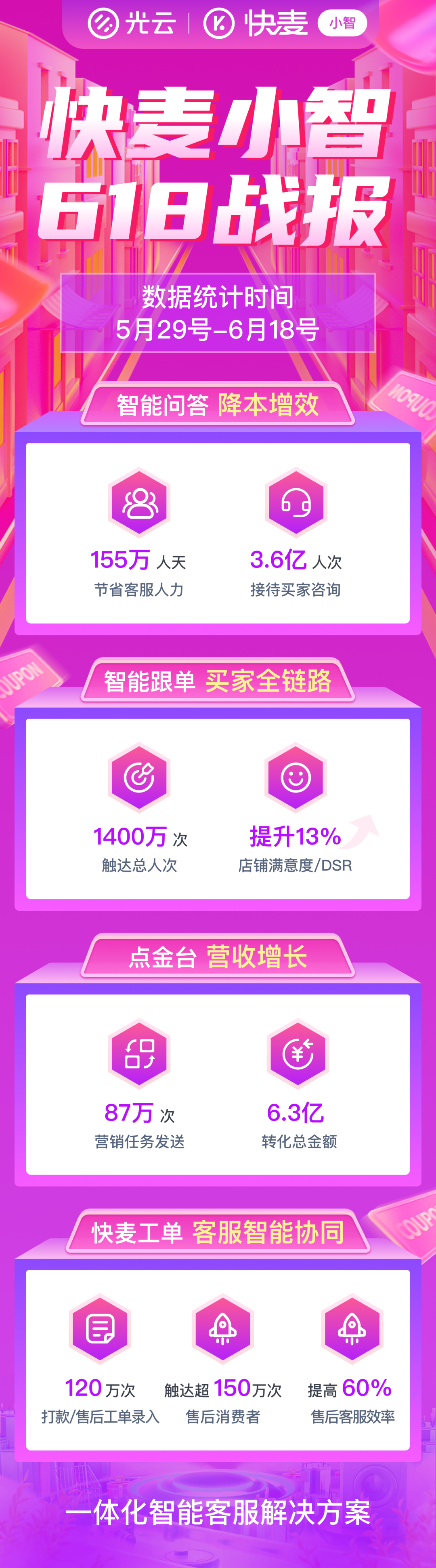 以快麦小智为例,快麦小智全链路订单解决方案,从智能催拍、预售催付、付款关怀到催评提醒,将售前、售中、售后精细拆分成20个环节,每个环节提供精细化交互服务,帮助商家有效提升GMV的同时,也让用户感受到更细致的服务和关怀。618期间,快麦小智智能跟单功能触达总人次1400万,帮助商家提升店铺满意度13%;点金台营销任务发送87万次,实现6.3亿元的金额转化。